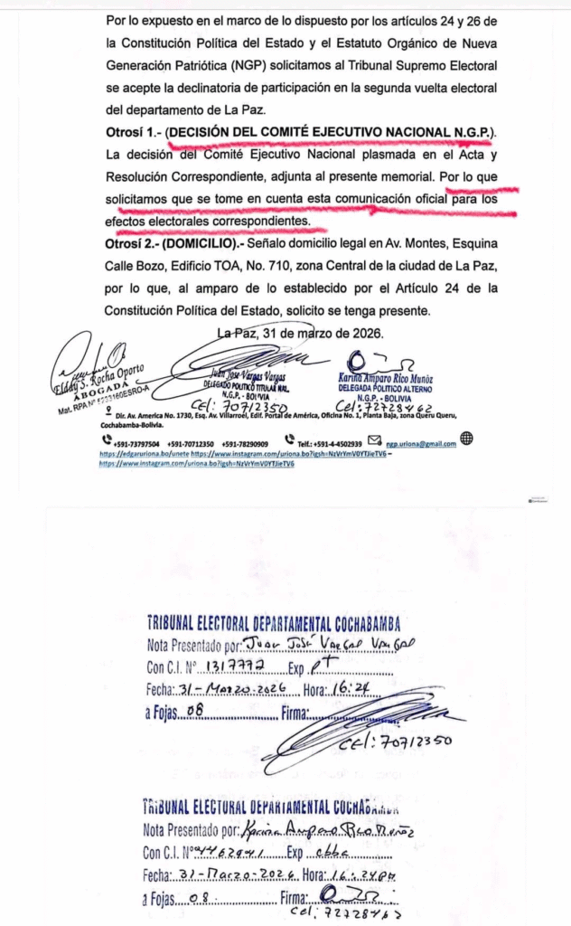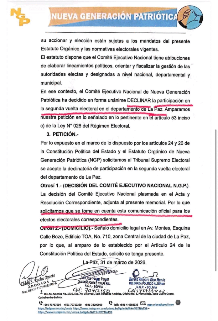 Nueva Generación Patriótica (NGP) formalizó su retiro de la segunda vuelta en La Paz mediante un memorial presentado ante el Tribunal Supremo Electoral (TSE). La decisión, asumida por unanimidad por su dirigencia, implica la declinación de la candidatura de René Yahuasi y fue comunicada oficialmente con documentación recibida el 31 de marzo de 2026.