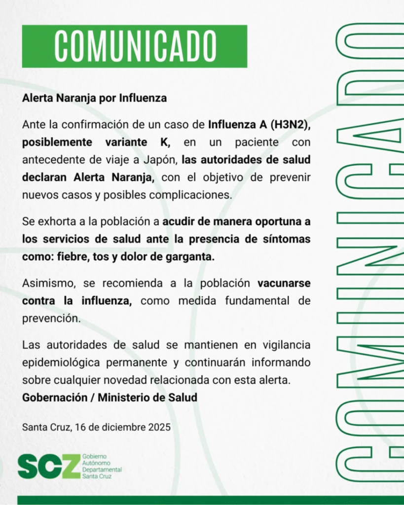Por otro lado, el Sedes de Santa Cruz informó sobre un caso sospechoso de fallecimiento por influenza A H3N2, variante K, que derivó en la declaratoria de alerta naranja en el departamento. Según el reporte, se trata de una mujer de 26 años que murió el 29 de noviembre tras presentar síntomas compatibles con la enfermedad, luego de haber llegado desde Japón. Ante la situación, la entidad anunció la habilitación de un centro centinela y reiteró el llamado a reforzar la vacunación contra la influenza.