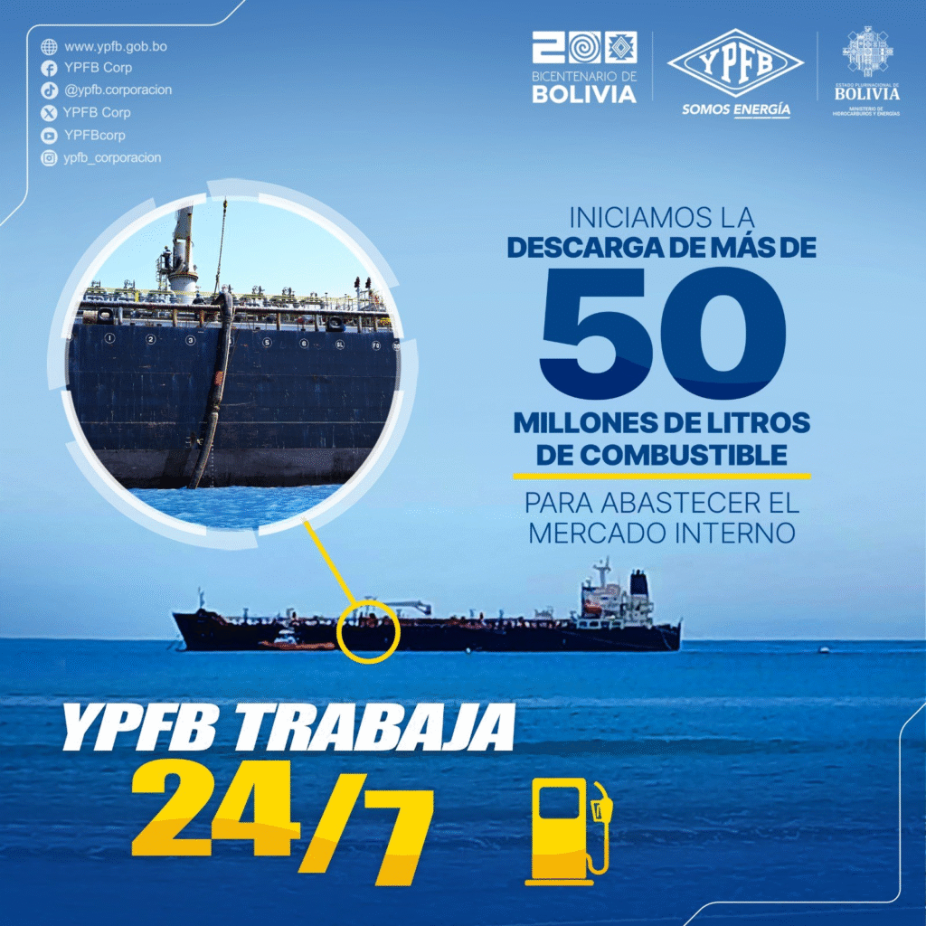 A pesar de las dificultades económicas que enfrenta el país, iniciamos la descarga de más de 50 millones de litros de gasolina en la terminal de Sica Sica, Chile. Nuestro propósito es atender de manera urgente la demanda de la población, informó la estatal petrolera por medio de sus redes sociales.